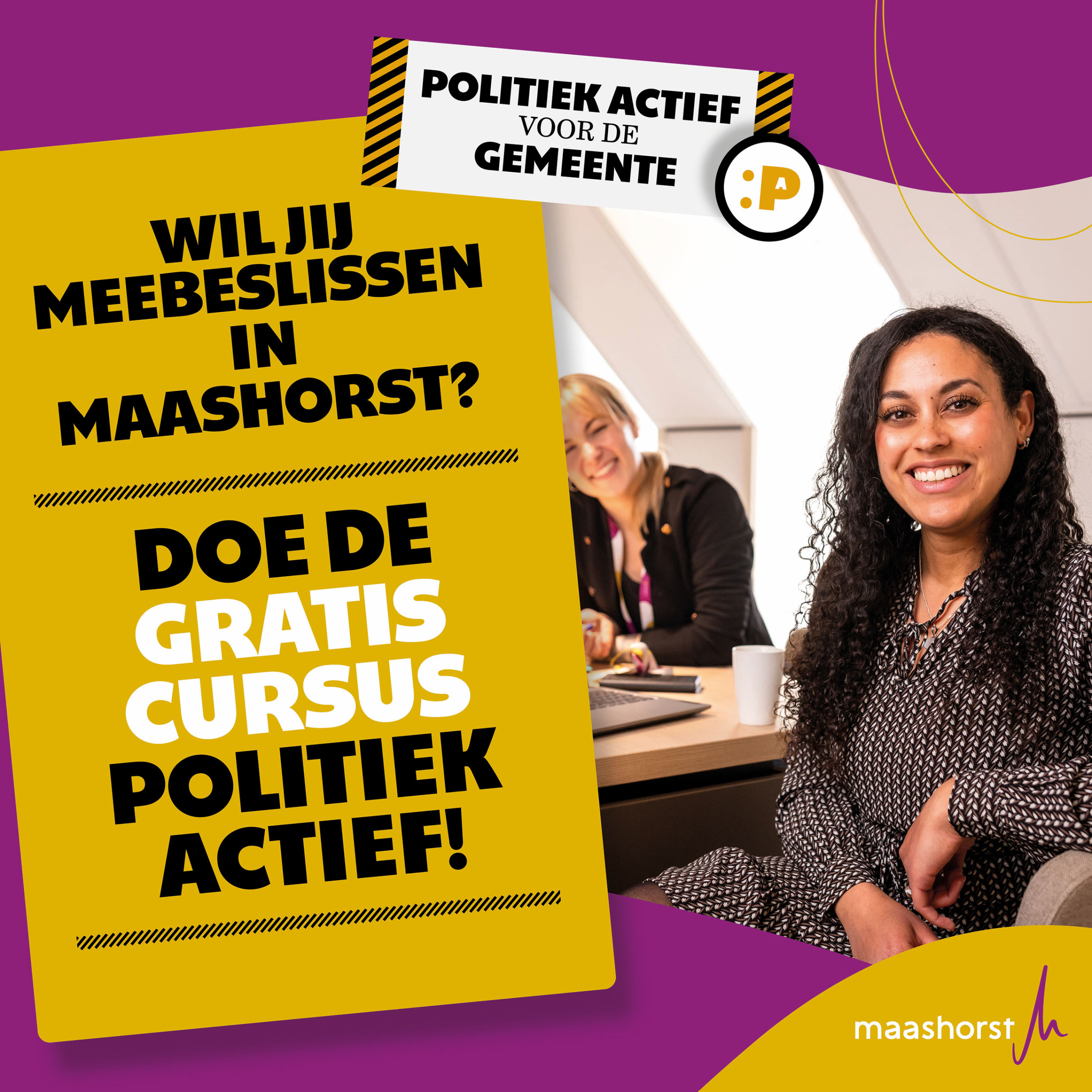 De cursus Politiek Actief is speciaal voor inwoners van de gemeente Maashorst die overwegen politiek actief te worden, bijvoorbeeld door zich in te zetten voor een politieke partij. Je kunt de cursus zien als een goede voorbereiding op werkzaamheden in een gemeenteraad of commissie. Ook inwoners die beter willen begrijpen hoe zij invloed kunnen uitoefenen op de lokale politiek zijn welkom. De cursus laagdrempelig en praktisch, en je hebt geen voorkennis nodig. De minimale leeftijd om deel te nemen is 16 jaar. Deze cursus is niet bedoeld voor mensen die al politiek actief zijn.