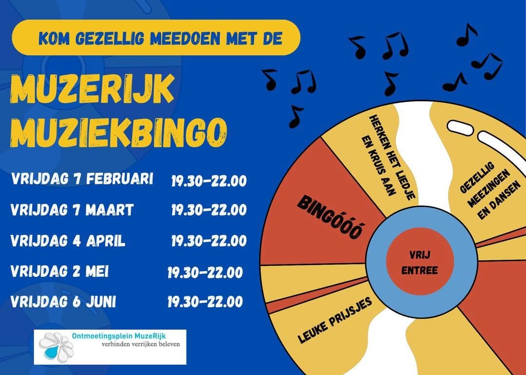 Bij ontmoetingsplein MuzeRijk hebben ze een nieuwe muziek-activiteit, nl. de MuzeRijk Muziekbingo. Dit is iedere eerste vrijdag van de maand .Vrijdag 7 februari was de eerste muziekbingo bij ontmoetingsplein MuzeRijk. De volgende muziekbingo is op vrijdag 7 maart, inloop vanaf 19.00 uur, aanvang 19.30 uur. Deze keer is het thema de ‘After carnaval’ muziekbingo.Leuk dus voor de carnavalsvierders die nog even willen nagenieten. Publiek in de leeftijd van 15-80 jaar is van harte welkom. Men luistert naar herkenbare, gezellige muziek. Mee dansen en zingen maakt het extra gezellig. Kruis de liedjes af op je bingokaart, en maak kans op een leuk prijsje! Tussendoor is er ook een muziekquiz waarmee je een extra prijs kan winnen.