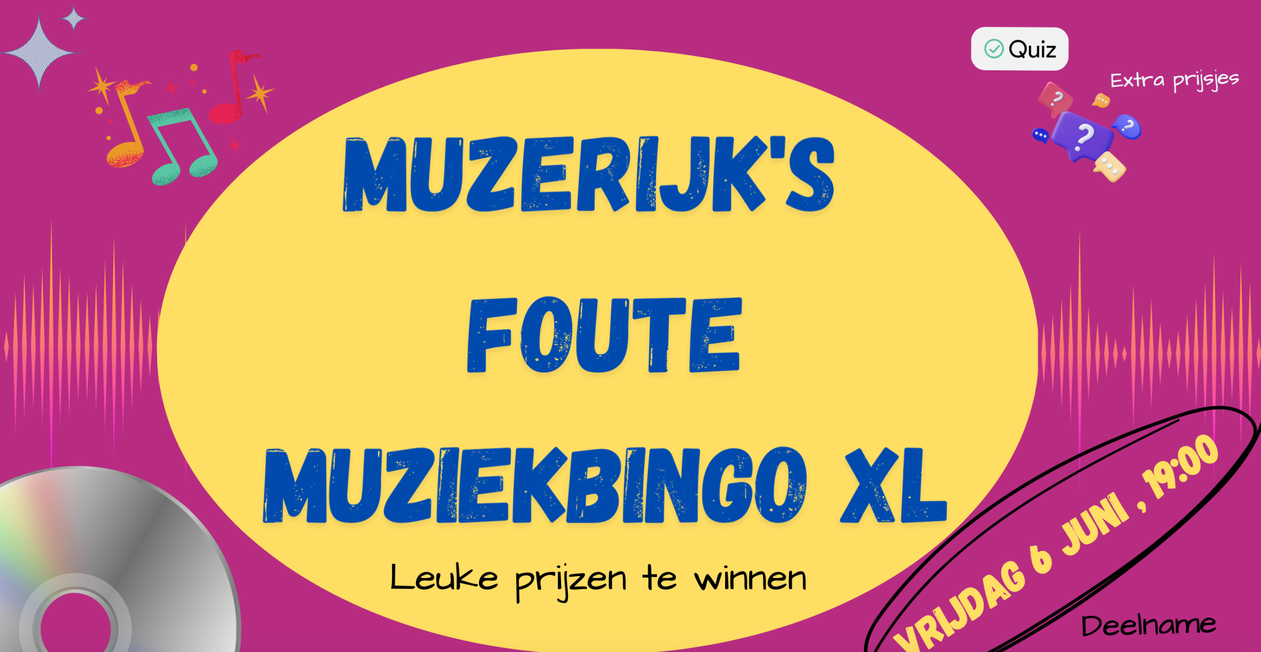 De volgende muziekbingo is op vrijdag 6 juni, inloop vanaf 19.00 uur, aanvang 19.30 uur. Deze keer is het thema de Foute Muziekbingo XL.