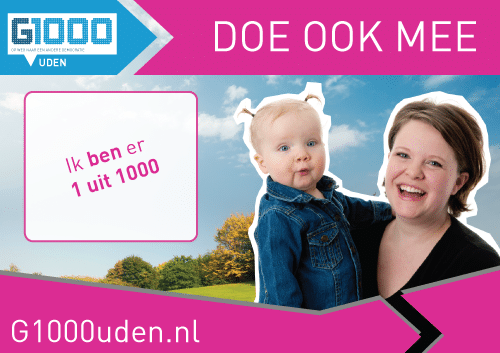 Op 4 oktober 2014 vond de eerste G1000-burgertop van Brabant en de 2e van Nederland plaats. In ons eigen Uden! Een G1000 is een nieuwe manier om als inwoners onze stem te laten horen. Het is een methode die inwoners van Uden, Volkel en Odiliapeel met elkaar in gesprek heeft gebracht om samen te bouwen aan een betere leefomgeving.